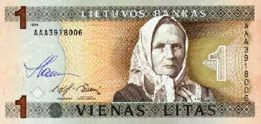 1994. Banknote of 1 Litas. The portrait on the banknote shows Julija Zemaite (1845-1921), a Lithuanian author of the same reputation as Selma Lagerlöf in Sweden. Mrs. Zemaite has been featured on a large number of stamps, both in her native Lithuania and in Russia.