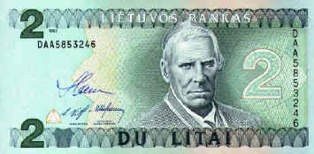 1993. Banknote of 2 Litai. The portrait on the banknote shows Motiejus [Matthew] Valancius (1801-1875). He was born in Kretinga on 28th February 1801 and was one of the most famous Lithuanians of the 19th century. He was bishop of Vilnius 1840-1842, and later in St. Petersburg 1842-1845. He opposed strongly the Czarist Government's decision to prohibit Lithuanian language and established therefore Lithuanian schools and published books in Lithuanian language. Having supported the uprising in 1863 against the Russian Czar, he was persecuted on 29th May 1875 in Kaunas.