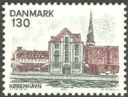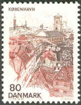 View from the top of the Round Tower. The "square" tower to the right is Copenhagen Cathedral, and the tall, slim tower to the left is Copenhagen City Hall. In the narrow street, running diagonally from bottom left to the middle is located the Central Post Office.