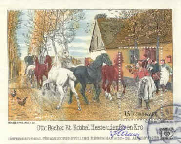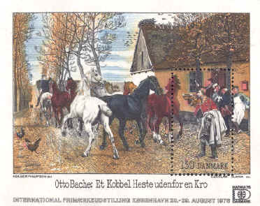 1976. Souvenir sheet from the stamp exhibition HAFNIA '76, Hafniasheet No. III. The sheet shows a classical Danish painting by Otto Bache "A String of Horses outside an Inn".