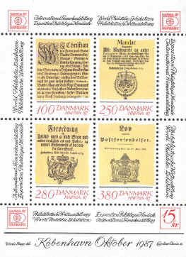 1985. Hafnia sheet No. I for the stamp exhibition HAFNIA '87. The stamps show old books containing ancient postal regulations. The stamps contained in the sheet are all valid for postage, but were not sold individually.