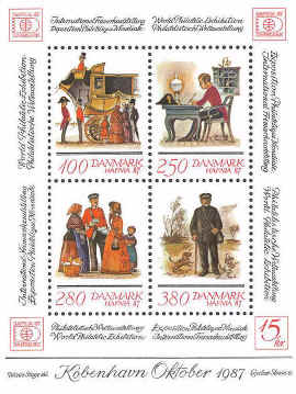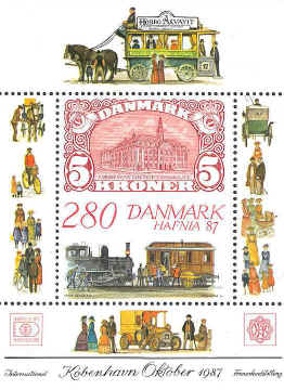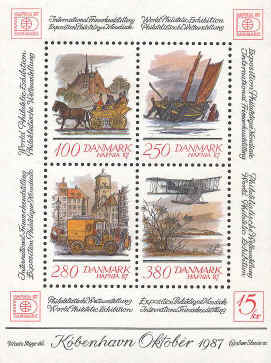 1986. Hafnia sheet No. II for the stamp exhibition HAFNIA '87. The stamps show means of postal deliveries through the times. The stamps contained in the sheet are all valid for postage, but were not sold individually.