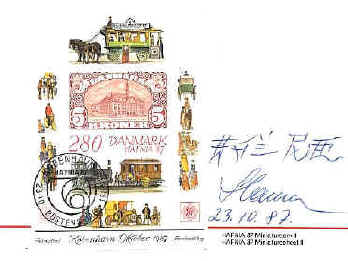 1987. I like this souvenir card from Hafnia '87 in Copenhagen. The backside of the card shows Slania's signature written in Chinese (by himself !), and dated 23rd October 87. If you study the reverse (grey) side of the card well, you can see a mirrored print of his signature in the lower left corner of the printed stamp.