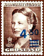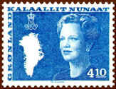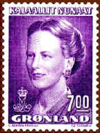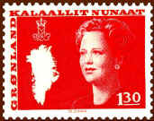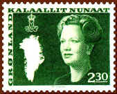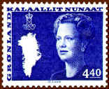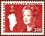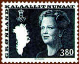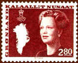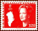 Finally, at the occasion of the Queen's 50th birthday in 1990, Greenland introduced the latest definitive series, showing the Queen at the age of 50. Her crowned monogram s placed at the bottom left. The series was issued during the period 1990-1996.