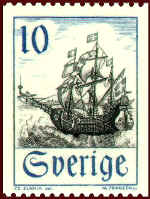 1967. Definitive stamp of 10 øre, showing a Swedish ship in the strait of Øresund, c. 1650. The stamp is part of a set of four stamps, of which Slania has designed this one.