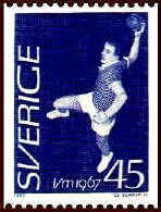 1967. World Championship in handball. The player is F. Lissvik (Sporvägens IF). This stamp comes in two values, the other being of Skr. 2,70 and violet colour (not shown here for space reasons). The championships were played in Sweden 12th-21st January 1967.