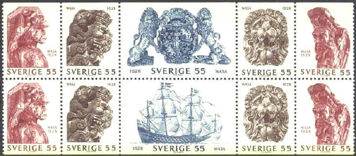 "Wasa" was capsized on her maiden voyage on 10th August 1628 and went down in Stockholm's Ström. She was salvaged in 1961. The above six stamps show naval decorations from the ship.