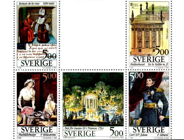 1994. Cultural Exchange Sweden-France. The stamps are out of a set of six, of which Slania has engraved the five stamps shown. The stamps appear in the booklet pane as shown here, with no upper or lower selvedge. The stamp Czeslaw Slania has not engraved, has been removed digitally by the webmaster.