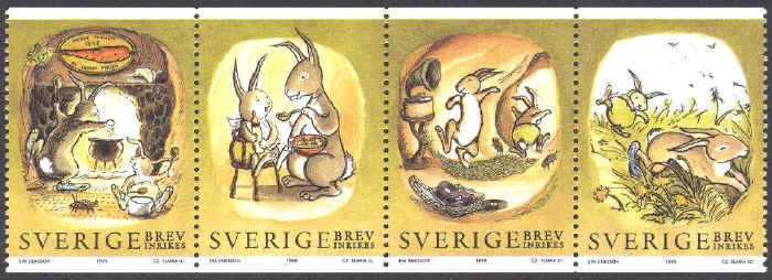 1999. Rabbits. Illustrations from a fairy tale book "Little Sister Rabbit", by Ulf Nilsson & Eva Eriksson. The four stamps were printed se-tenant in a horizontal strip as illustrated.